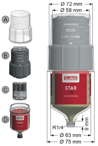 材料: 塑料外壳 驱动方式: 电池供电,电机驱动 组成: 驱动装置 + 电池 + 油杯 出油期: 1-12,15,18,21,24个月或1-26周(可设置) 设定: 按钮开关 + 液晶显示屏 可随时更改出油快慢和关闭加油器 容量: 60/120/250/500毫升 重量: 约542/612/774/1105克(SF01油脂) 出油压力: 最大7.5巴 适用温度: -40°C 至 +60°C 安装方向: 360度(油脂,无防尘罩时) 功能: 红绿LED灯工作状态指示,空杯报警,超压报警,低温报警,电池用完报警,手动加油 防水: IP65 标识: 驱动装置: SC-YYWW(生产日期,年年周周)-######(批号) 60毫升油杯: SS-YYWW-###### 120毫升油杯:SM-YYWW-###### 250毫升油杯:SL-YYWW-###### 500毫升油杯:SX-YYWW-###### 有效期: 驱动3年,油杯2年(其中油杯货架期1年,20°干燥避光保存) 应用范围: 滚动和滑动轴承, 链条, 开放式齿轮, 导轨等 需要精确加油的,无需提供电源